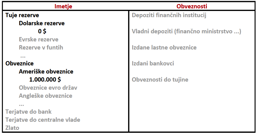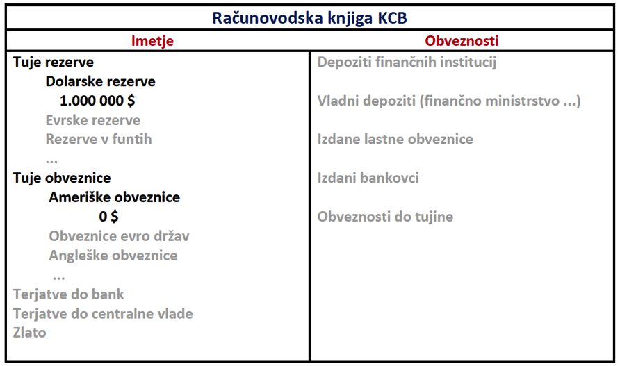 Na sliki 1 vidimo rahlo poenostavljeno računovodsko knjigo KCB – dober prikaz lahko pogledate tule (namenoma sem vse elemente razen dolarskih rezerv in dolarskih obveznic pustil nepoudarjene in brez konkretnih številk). Imetje KCB so med drugim dolarske rezerve pri Fed, ki jih ima za 1 milijon dolarjev (za Fed na drugi strani pa le-te predstavljajo obveznosti do KCB). Obenem nima še nobenih ameriških obveznic, zato se odloči, da bo s tem milijonom $ kupila obveznice. Nakup izgleda takole: