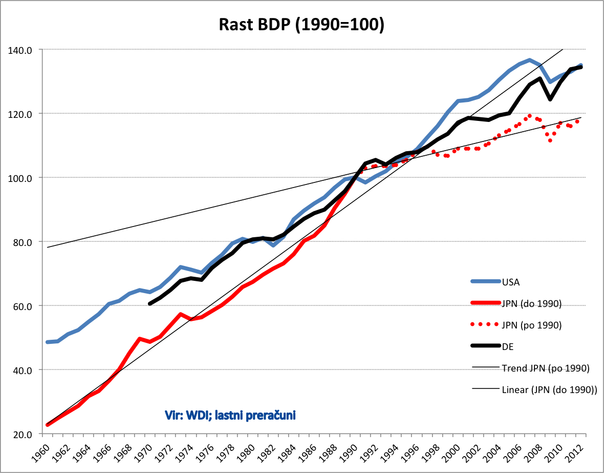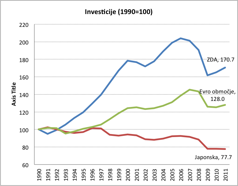 Na Japonskem se je zaradi prelaganja investicij na prihodnost obseg investicij ves čas po letu 1990 realno zmanjševal. Do konca leta 2010 je bil obseg investicij skoraj za četrtino manjši kot leta 1991. Za primerjavo, v istem obdobju se je realni obseg investicij v evro območju povečal za skoraj četrtino, v ZDA pa za dobrih 70%. Dokaj podobna je bila dinamika povpraševanja gospodinjstev. Izvoz in povečano javno trošenje nista mogla povsem nadomestiti izpada zasebnega povpraševanja. Logična posledica tega je dolgo obdobje stagnacije gospodarske rasti. Za primerjavo, medtem ko je ameriški BDP v obdobju zadnjih 20 let kumulativno zrasel za 63%, BDP evro območja za 35%, pa je na Japonskem zrasel le za 17%. Tak gospodarski skok je japonsko gospodarstvo v 1960-ih letih zmoglo v pičlem letu in pol.
