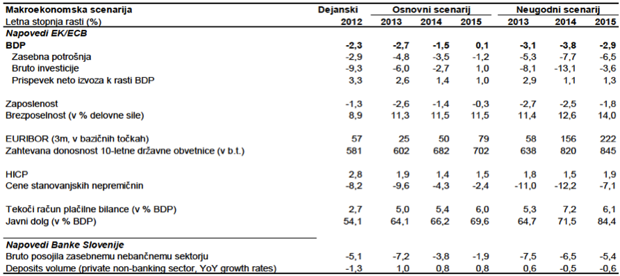 Slovenija je pri tem testu služila kot nekakšen poligon za testiranje bolj rigoroznih predpostavk. In v Sloveniji sta ocenjevalca (Oliver Wyman za “bottom-up” in Roland Berger za “top-down” test) uporabila resnično zelo drastične predpostavke makroekonomskih šokov. Predpostavili so, da bi se v Sloveniji zgodila (nova) in zelo globoka gospodarska recesija. Ta šok bi bil okrepljen zaradi okolja, v katerem deluje slovensko gospodarstvo ter makroekonomskih politik EU, ki od članic zahtevajo strukturne reforme, zmanjšanje strukturnih neravnovesij in fiskalno konsolidacijo (zmanjšanje proračunskih deficitov). Posledično bi se domače povpraševanje zmanjšalo kar za 18%, investicije pa za 23%, kar bi ob zmerni rasti izvoza do leta 2015 povzročilo skupen upad BDP za 9.5% (za primerjavo, od leta 2009 do danes je upadel za dobrih 10%). Zaposlenost bi se zmanjšala za skoraj 7%. Zaradi tega negativnega šoka bi se premija za tveganje na finančni trgih za Slovenijo močno povečala, kar bi dvignilo ceno zadolževanja. Hkrati bi zaradi povečanega tveganja ter nižje kupne moči cene delnic na kapitalskem trgu upadle za 25%, cene nepremičnin pa za 27%. Ob tem ocenjevalci predpostavljajo še porast euriborja za skoraj 3-krat. Vse skupaj bi seveda po eni strani močno poslabšalo sposobnost poplačila kreditov s strani komitentov, na drugi strani pa drastično poslabšalo absorpcijsko sposobnost bank za ublažitev teh šokov.