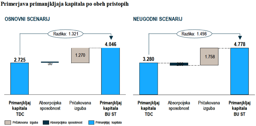 Na osnovi teh predpostavk sta bila izvedena oba makro stres testa, ki sta ocenjevala celotne pričakovane izgube bank na eni strani ter absorpcijsko sposobnost bank, da ublažijo te izgube, na drugi strani. V absorpcijsko sposobnost bank se štejejo stanje dosedanjih oslabitev oziroma rezervacij, dobiček bank in kapitalski blažilniki. Za razliko med potencialno izgubo bank in sposobnostjo bank, da te izgube absorbirajo, morajo banke zagotoviti svež kapital v obliki najbolj kakovostnega temeljnega kapitala (Core Tier 1). Pri tem pa zahteva po kapitalski ustreznosti v primeru neugodnega makroekonomskega šoka znaša 6% (v primeru bolj milega osnovnega scenarija pa 9%).