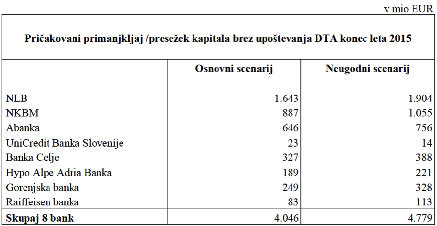 Slovenska vlada in BS pri oceni potrebnega dodatnega kapitala bank izhajata iz bolj konzervativnega »bottom-up« makro stres testa. Velika večina (skoraj 80%) kapitalskih potreb se nahaja v treh bankah v državni lasti (NLB, NKBM in Abanka), ki jih bo država v naslednjih dveh letih morala dokapitalizirati z dobrimi 3 milijardami evrov. Od tega bo NLB potrebovala za 1.9, NKBM za dobro milijardo evrov, Abanka pa za dobrih 750 milijonov evrov. Medtem ko so banke v tujem lastništvu večinoma dobro kapitalizirane in bodo skupaj potrebovale le za dobrih 350 milijonov evrov svežega kapitala, pa so ostale manjše domače banke v bistveno slabšem položaju, saj bo Banka Celje potrebovala za skoraj 390 milijonov evrov kapitala, Gorenjska banka pa za 330 milijonov evrov. Lastniki obeh bank imajo čas 6 mesecev, da banki dokapitalizirajo, sicer bo morala poseči država. Glede na slabo finančno kondicijo lastnikov obeh bank, to zelo verjetno njuno državno reševanje in dodatno kapitalsko injekcijo države v višini 720 milijonov evrov v sredini naslednjega leta.