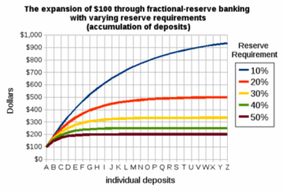 Slika: Multiplikacija depozita (100 $) v bančnem sistemu prek kreditov na podlagi različnih rezervnih zahtev (vir: Wikipedia)