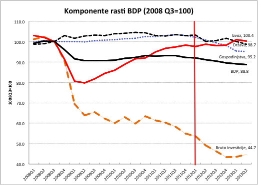 Vse lepo in prav, toda to je bila napaka. Če bi si kdo na ministrstvu za finance takrat vzel 15 sekund časa in pogledal na spletno stran SURS indekse rasti komponent BDP, bi hipoma ugotovil, da problem ni v ponudbi, ampak v povpraševanju. V prvem četrtletju 2012 je bila slika naslednja: investicije so bile za dobrih 46% nižje kot pred začetkom krize (tretje četrtletje 2008) in še naprej strmo upadale, izvoz je bil nižji za 2.4% in stagniral, državna poraba je bila za 3.1% višja in stagnirala, poraba gospodinjstev pa višja za 2.1%, vendar v padajočem trendu (glejte sliko).