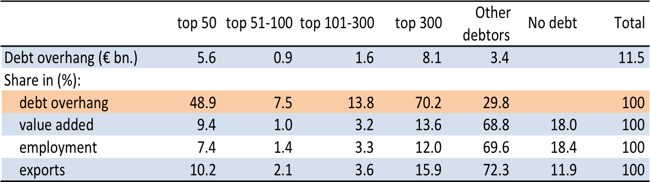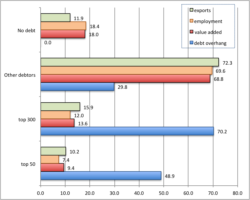 Res je, da je dolg zelo koncentriran: 50 največjih dolžnikov ima kar polovico celotnega presežnega dolga, 300 največjih dolžnikov pa kar 70% celotnega presežnega dolga. Toda reševanje zgolj največjih dolžnikov ne bo imelo bistvenega učinka na gospodarstvo, saj ima 300 največjih dolžnikov skupaj le 12% vseh zaposlenih, 14% celotne dodane vrednosti in 16% celotnega izvoza: