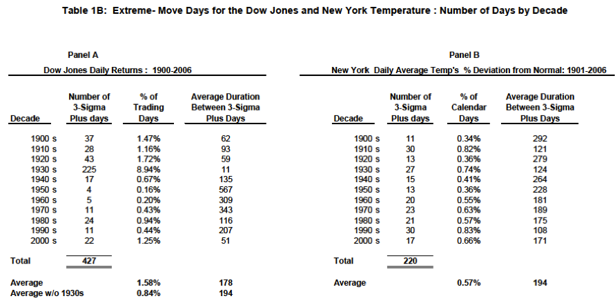 Še več, kot kaže spodnja primerjava, je vreme precej manj volatilno od finančnih trgov. V istem časovnem obdobju 1900-2006 je denimo temperatura v newyorškem Centralnem parku 220-krat odstopala za 3 ali več standardne odklone od dolgoletnega povprečja na isti dan, medtem ko je Dow Jones v istem obdobju doživel kar dvakrat več (427) 3-sigma šokov.