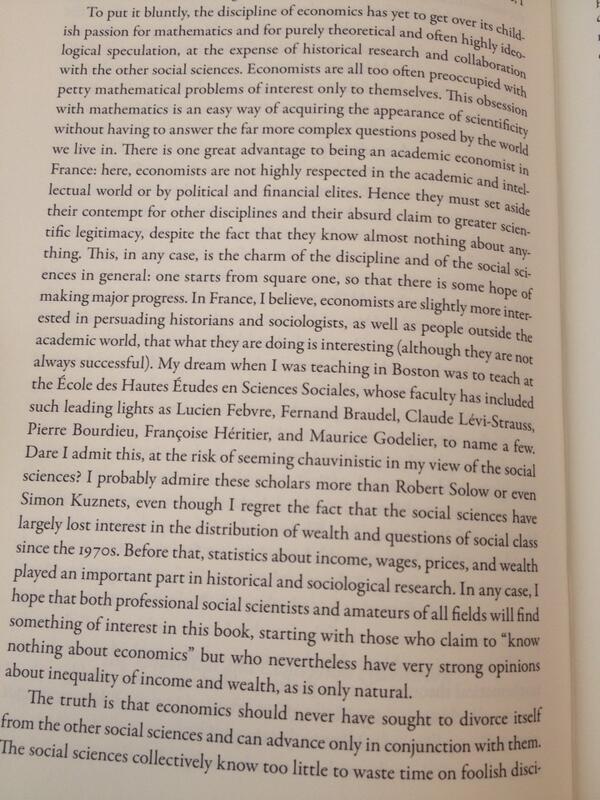 Piketty je sicer zelo prijazen fant. Svoje rezervirano mnenje o profesiji in kolegih, ki jih bolj zanima matematika kot vsebina, pa si lahko več kot privošči. Ob pogledu na njegov CV in zbirko objavljenih člankov v QJE, JPE, AER in RES nas vse, hočeš nočeš, zagrabi zavist. (tukaj sledi vulgarna kletvica po izboru naših južnih bratov)