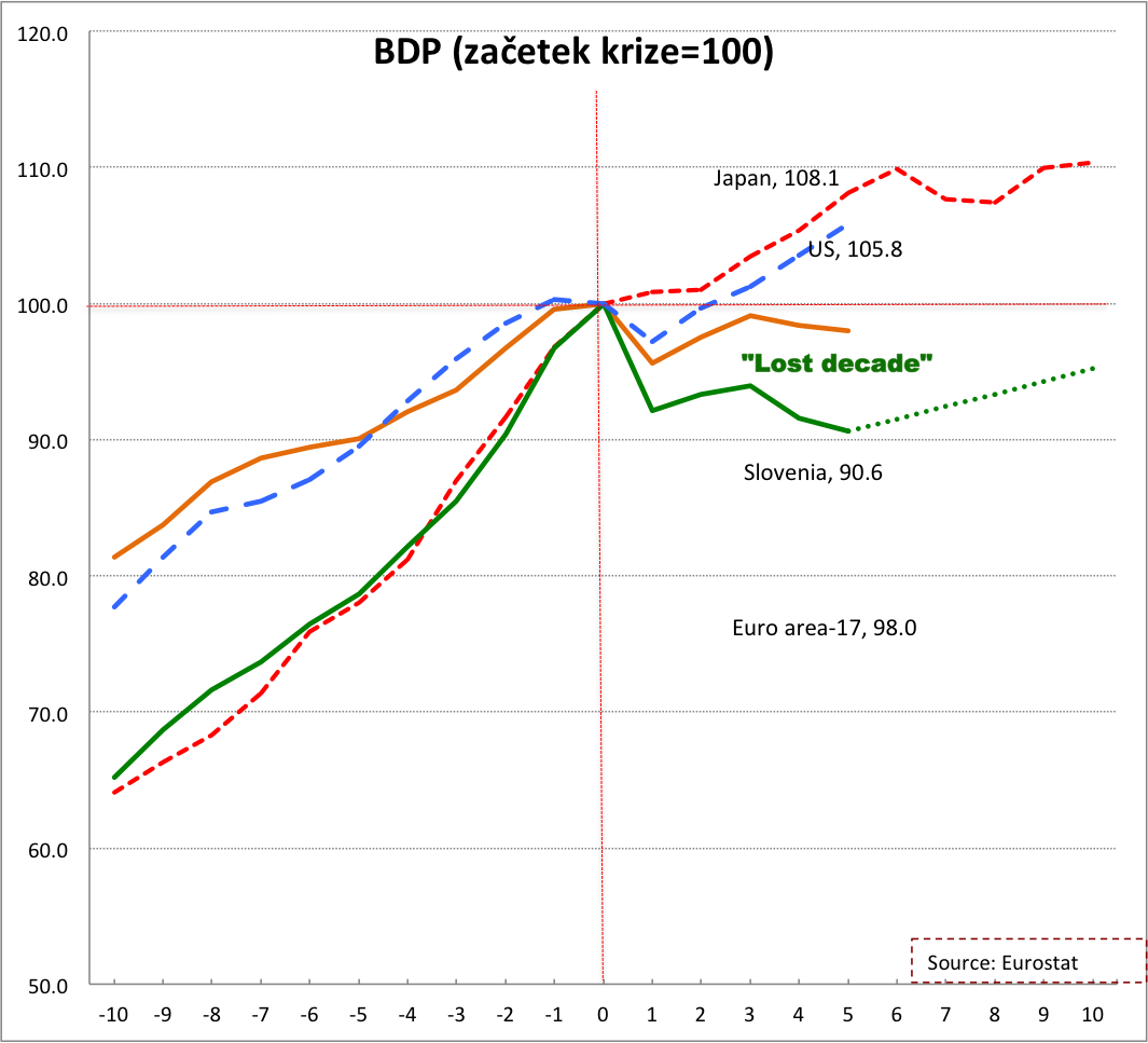 Tja, potem pa sem za včerajšnje predavanje na Jožefu Stefanu pripravil sliko, v kateri sem primerjal, kaj se je zgodilo z evro območjem, ZDA in Slovenijo v času te krize glede na Japonsko. Začetek krize sem dal v točko 0 in nato primerjal trajektorije rasti po začetku krize. In kot lahko vidite, je bila Japonska v času njene krize pravi tiger v primerjavi z nami. Ne Japonska, mi smo izgubili že najmanj eno desetletje. Američani so blizu japonskega kriznega trenda, evro območje pa je vmes, vendar še vedno ni zlezlo iz brezna.