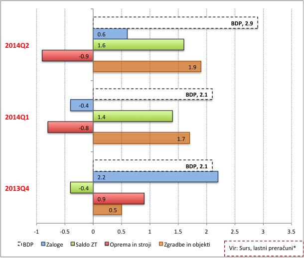 Rast ni temeljila na močno povečanem trošenju gospodinjstev ali države. Nasprotno obe sta še vedno depresivni. Pač pa je rast v zadnjem četrtletju temeljila na izjemni rasti zalog – te so prispevale kar 2.2 odstotni točki (o.t.) k gospodarski rasti, ki je znašala 2.1%. 0.9 o.t. so prispevale investicije v stroje in opremo, 0.5 o.t. investicije v zgradbe in objekte, medtem ko je saldo zunanje trgovine zaradi hitrejše rasti uvoza od izvoza negativno vplival na rast v višini 0.4 o.t. Zdaj pa poglejmo obe četrtletji letošnjega leta, pri čemer obdržite oko na postavki »zgradbe in objekti«. Vidite? V prvem četrtletju letos so k skupni rasti BDP investicije v zgradbe in objekte prispevale 1.7 o.t., v drugem četrtletju pa že 1.9 o.t. Obakrat več kot pa je prispeval saldo zunanje trgovine, medtem ko so podjetniške naložbe v stroje in opremo BDP vlekle navzdol.
