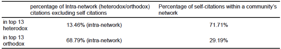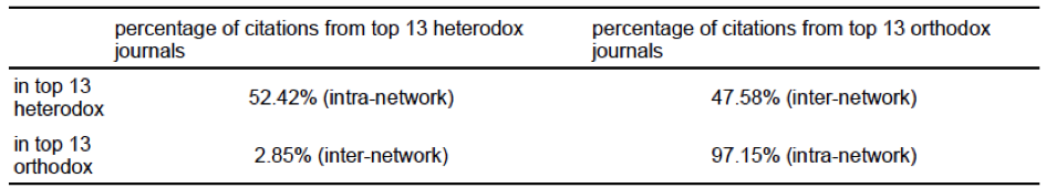 V okviru ortodoksnih revij je bilo samo 2,85 % vseh citatov heterodoksnih in kar 97,15 % ortodoksnih (tabela 1), kar nakazuje na popolno ignoranco neoklasične doktrine do heterodoksnih pristopov (znanstvenega diskurza tu praktično ni). Vendar pa je po drugi strani v okviru heterodoksnih revij skoraj 48 % vseh citatov ortodoksnih in le dobrih 52 % heterodoksnih. Po drugi strani pa je delež samocitiranja veliko višji znotraj heterodoksnih smeri kot znotraj ortodoksne (tabela 2).
