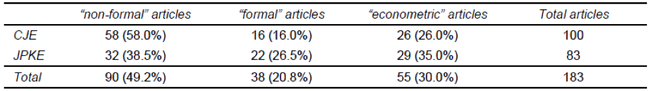 Tabela 3: Neformalni, formalni in ekonometrični članki v dveh vodilnih post-keynesianskih revijah v letih 2007 in 2008