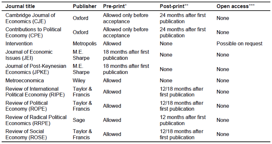 Avtorja sta pregledala možnost lahkega dostopa do člankov v top 10 post-keynesianskih ekonomskih revijah in ugotovila, da je ta precej omejen (tabela 4).