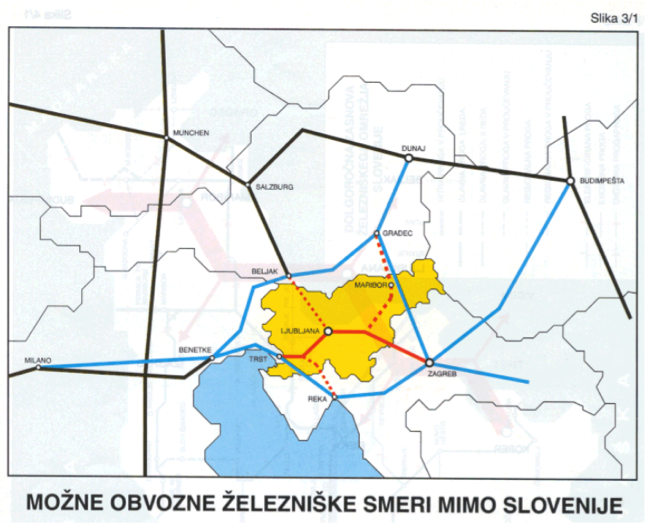 Na sliki 3/1 so prikazane možne obvozne visoko zmogljive železniške smeri mimo Slovenije. Z njihovo uresničitvijo bi Slovenija izgubila glavnino svojih prevoznih prihodkov iz železniškega in pristaniškega prometa. Ker gre za visoko kakovosten izvoz storitev, ki ne onesnažujejo okolja, in za dejavnost, v kateri ima Slovenija s svojim železniškim in pristaniškim sistemom realne primerjalne prednosti, bi bila to nepopravljiva škoda. To možno nevarnost je treba v tem programu najresneje upoštevati. V nadaljevanju so opisani interesi posameznih držav na tem področju.