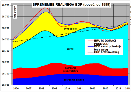 Še bolj lepo pa se vidi druga značilnost in sicer, kako je visoka predkrizna rast temeljila predvsem na investicijski aktivnosti, enako kot tudi padec gospodarske aktivnosti izhaja večinoma iz upada naložb. Ostali trije segmenti kreiranja BDP (izvoz ter potrošnja gospodinjstev in države) pa izkazujejo celotno obravnavano obdobje celo neko skromno rast, praktično brez krize. Prikaz sicer zahteva več komentarja in pojasnil, a namen je bil samo v sintetiziranem prikazu ključnih gibanj v naši ekonomiji – le-ta pa so s tega vidika vsekakor zanimiva in tudi nekoliko drugačna kot se jih običajno vidi.
