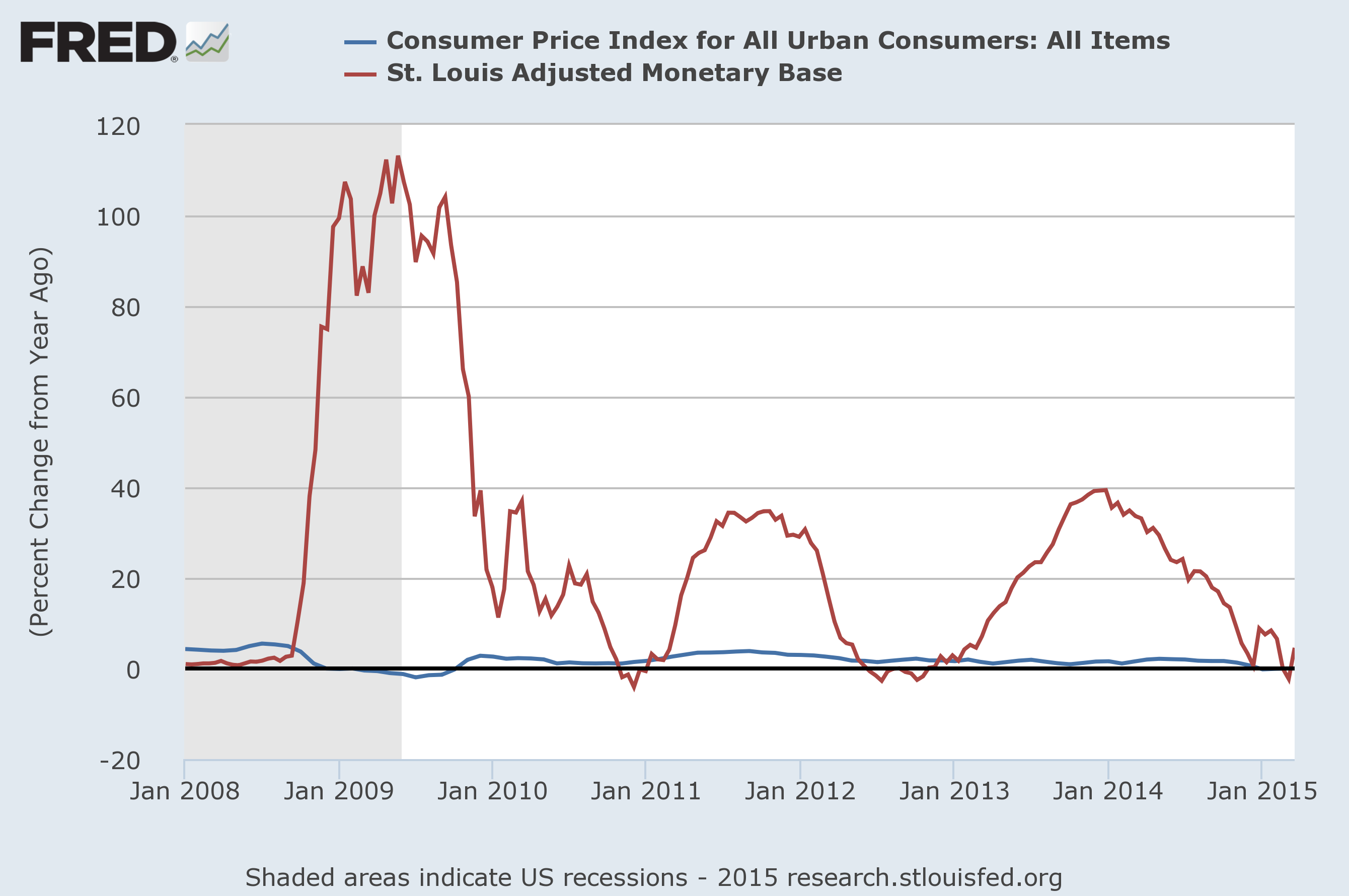Slika 4: Ekspanzivna monetarna politika in inflacija v Veliki recesiji v ZDA (2008-2015)