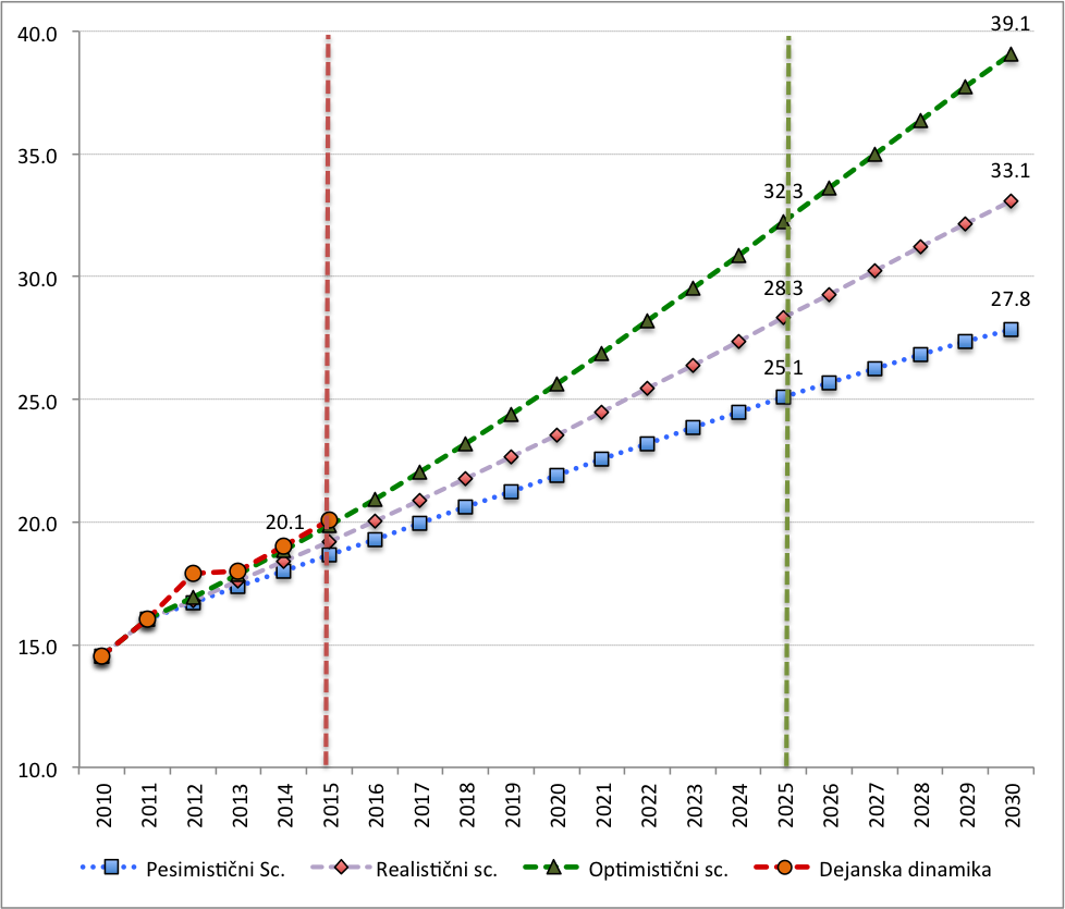 Slika 2: Projekcije prevoza tovora iz Luke Koper po železnici do 2030 (v mio ton)