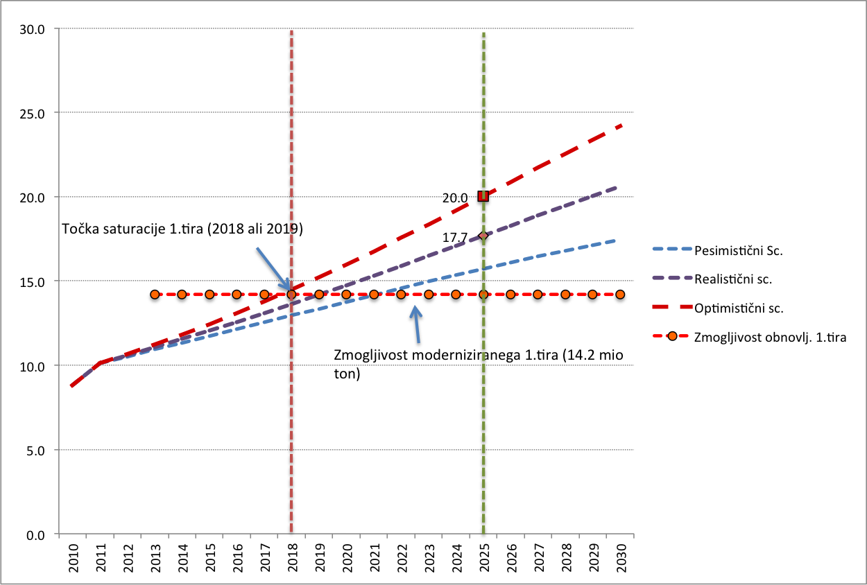 Najprej prvi “argument, da Luki Koper ne bo uspelo ustvariti dovolj pretovora. Pred leti (2012) sem v študiji za Luko Koper (LK) med drugim naredil projekcije rasti pretovora do leta 2040. Izhajal sem iz dotedanje 15-letne dinamike pretovora šestih različnih vrst tovora in iz tedanjega stanja (recesija v evro območju) ter oblikoval tri scenarije: pesimističnega, realističnega in optimističnega (glede predpostavk glejte študijo).