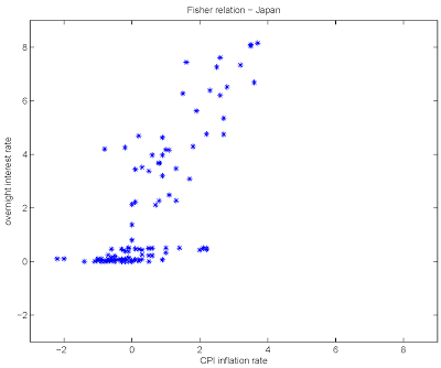 Anyway, unlike Kocherlakota, Williamson has stuck to his guns. Last December, he wrote a blog post suggesting that Paul Volcker whipped inflation in the early 80s not by raising interest rates in the short term, but by lowering them in the long term. In February he wrote that “there’s a clear Fisher relation in the data” for both Japan and the U.S., posting this graph: