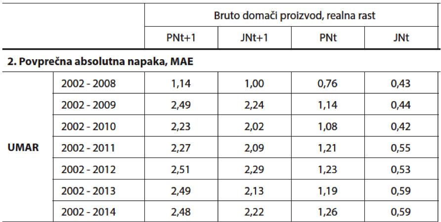 Bine Kordež ima prav, ko se rad priduša nad nezanesljivostjo uradnih napovedi rasti (slovenskega) BDP. Spodaj je izsek iz povprečnih absolutnih napak napovedi, ki jih zase (in druge institucije) zelo verno prikazuje UMAR. Do 2008 je bila napaka napovedi rasti BDP 2 leti vnaprej (PNt+1) še “samo” 1.14 o.t. (odstotnih točk). Torej, če je bila rast 3%, je UMAR v povprečju napovedal, da bo bodisi 1.86% bodisi 4.14%. Toda po 2008 se je preciznost napovedi zaradi večje volatilnosti gospodarskih gibanj dramatično poslabšala: dve leti vnaprej se UMAR glede napovedi rasti BDP povprečno zmoti za 2.5 o.t., isto leto pomladi za 1.3 o.t. in isto jesen za 0.6 o.t. Drugače rečeno, če UMAR za naslednje leto napove rast BDP v višini 2.5%, si s tem ne morete nič pomagati, ker bo dejanska rast lahko bodisi 0% bodisi 5% ali kaj tretjega.