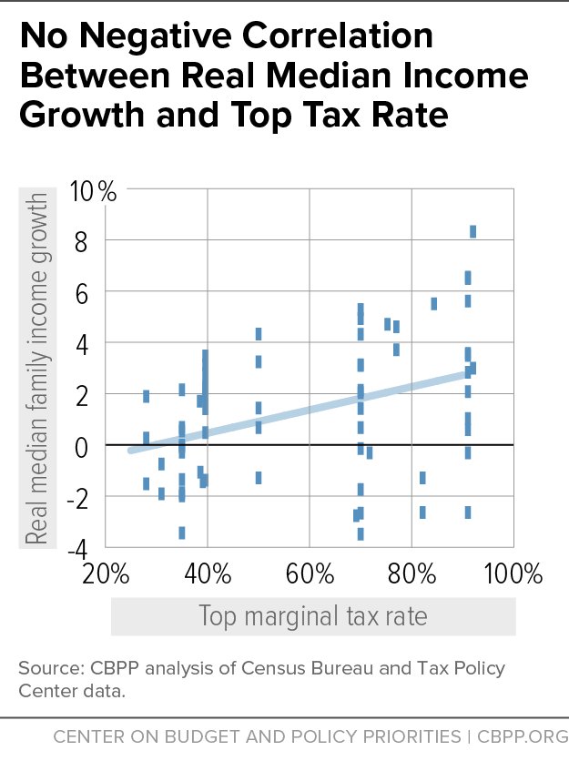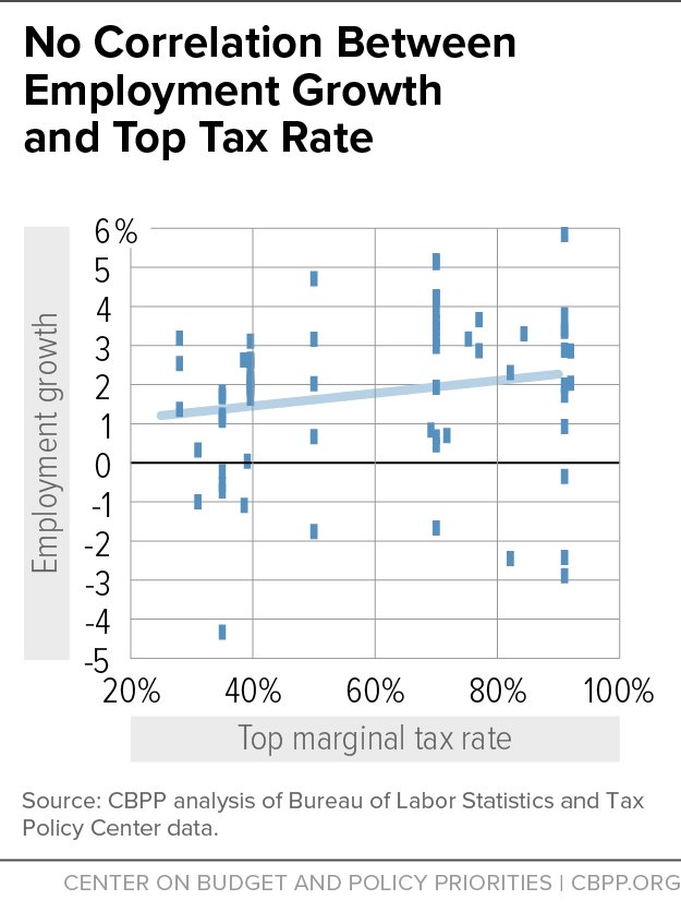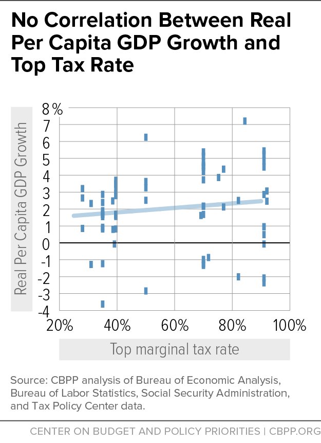Med višino mejnih davčnih stopenj in gospodarsko rastjo ni statistično značilne povezave. Če že, pa bi bila kvečjemu pozitivna – torej, da je ob višjih davkih rast BDP višja.