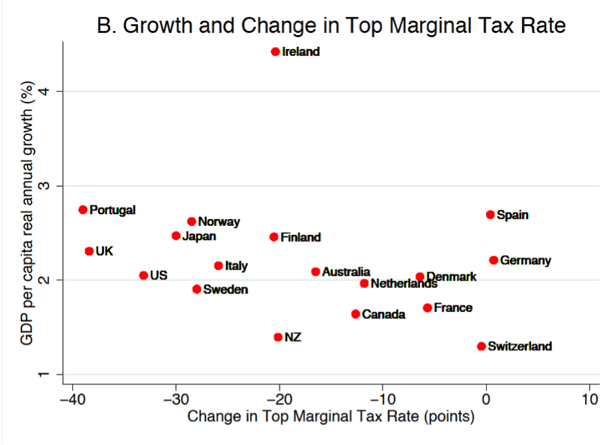 Piketty, Saez & Stantcheva (2011) so leta 2011 naredili raziskavo za 18 OECD držav, kjer prav tako niso našli značilne povezave med višino najvišje davčne stopnje in gospodarsko rastjo. Povezave tudi ni med gospodarsko rastjo in znižanjem najvišje davčne stopnje: