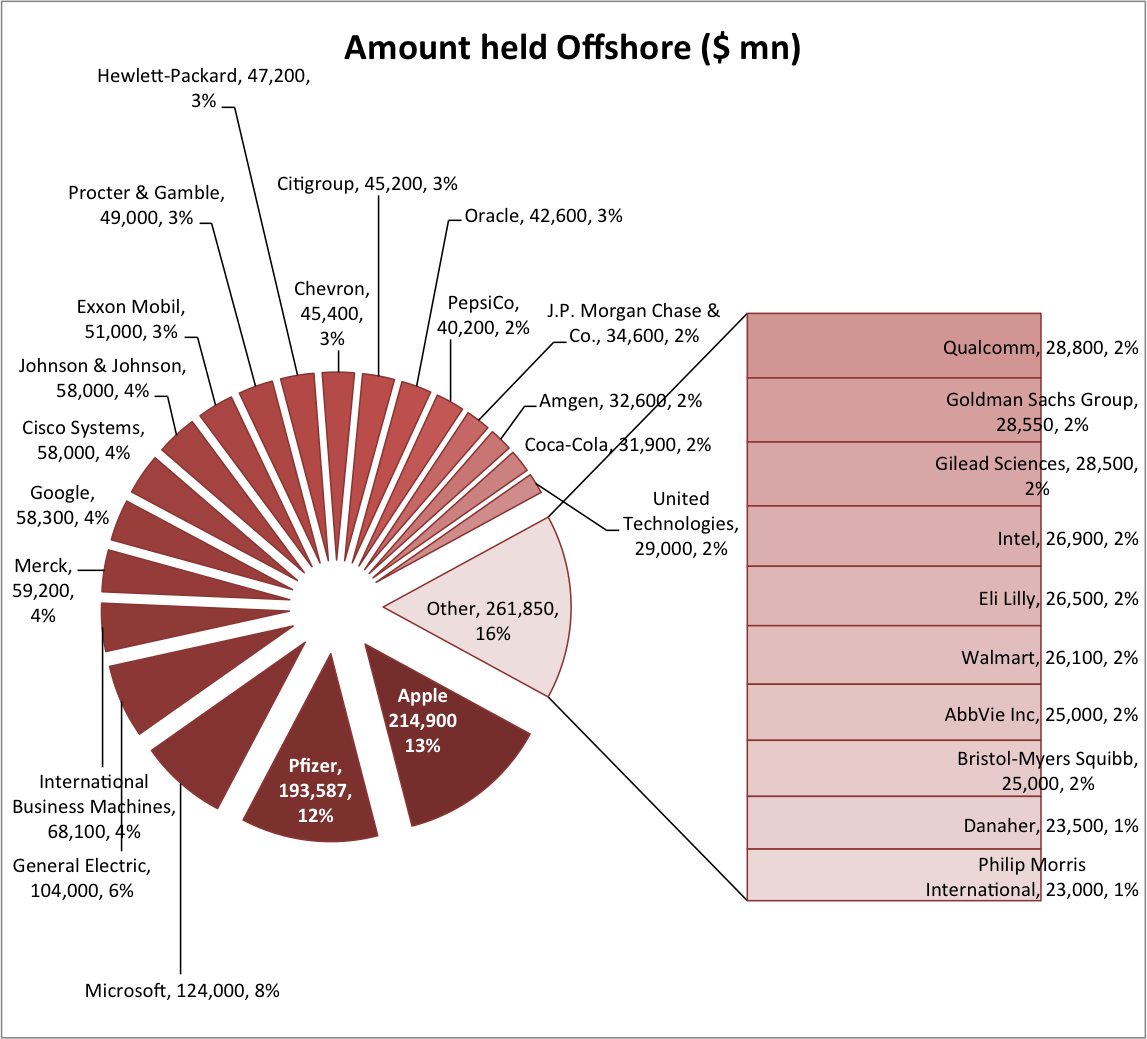 Nedavno razkritje New York Timesa, da predsedniški kandidat republikancev Donald Trump zadnjih 18 let, povsem legalno, (najbrž) ni plačal niti centa zveznega davka na dohodek, ker je spretno izkoristil to, da je leta 1995 s katastrofalno slabimi naložbami v igralnice in hotele pridelal za 916 milijonov dolarjev izgube, je dejansko kikiriki (zanemarljivo majhno, kapljica v morje) v primerjavi s tem, koliko davka utajujejo (se mu izogibajo) ameriške korporacije. Prejšnji teden objavljena študija Offshore Shell Games 2016 (US PIRG, CTJ, ITEP) namreč kaže, da 500 največjih ameriških korporacij na Forbesovi lestvici pred ameriško davkarijo v tujini v davčnih ozazah skriva za 2,500 milijard dolarjev dobičkov. Od tega 30 največjih korporacij za 1,650 milijard dolarjev. Kot lahko vidite na spodnji sliki, je rekorder Apple z 215 milijardami dolarjev skritega dobička v svojih podružnicah (predvsem na Irskem). Sledi Pfizer s 194 milijardami, General Electric s 104 milijardami in nato plejada najbolj znanih tehnoloških, farmacevtskih in finančnih družb s v tujini spravljenimi dobički v višini med 40 in 100 milijardami dolarjev vsaka.