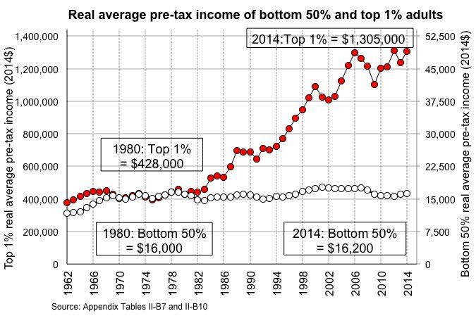 Zakaj so mrtve? Ker se koristi od rasti zadnjih 40 let zelo neenakomerno porazdeljujejo. Spodnjim 50% populacije se od leta 1980 dohodek ni povečal niti za mišjo dlako, medtem ko se je zgornjemu 1% več kot potrojil (glejte spodnjo sliko). Spodnjih 50% Američanov ima negativno premoženje, ne more si privoščiti dragih zdravstvenih storitev in dragih šol za njihove otroke. Zato bo njihovim otrokom šlo še slabše kot njim.
