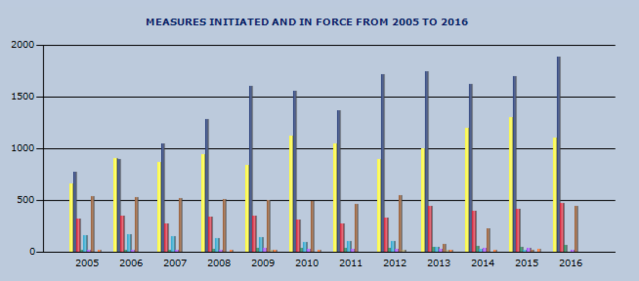 Po podatkih WTO so leta 2007 njegove članice sprožile 157 protidumpinških ukrepov, leta 2016 pa že 287. Med letoma 2007 in 2016 se je število fitosanitarnih trgovinskih ovir med članicami povečalo iz 240 na 329, število tehničnih ovir pa iz 27 na 451. Število na novo sproženih tehničnih ovir je do leta 2016 poraslo na preko 1,400, pri čemer pa niso vse pobude tudi uspešne. Po letu 2008 je bilo uveljavljenih 343 novih zahtev na javnih razpisih po lokalnem poreklu izdelkov.