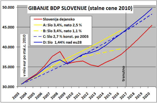 Temu izračunu sem dodal še dve varianti, in sicer sem tretji (varianta C) prav tako dodal k letni povprečni rasti Evropske Unije (28 držav) še 1,44 odstotne točke ali skupaj 2,7% letno realno rast za celotno obdobje po letu 2003. Za teh 1,44 odstotne točke je bila rast slovenskega BDP v povprečju višja od evropskega povprečja v obdobju naše stabilne in uravnotežene rasti (1995-2003), zaradi česar menim, da je to realno pričakovan dosežek. Tu gre za konstantno rast celotno obdobje, dodal pa sem še alternativno varianto (D), po kateri pa bi bila rast višja za teh 1,44 točke vsako posamezno leto glede na rast (ali padec) povprečja EU. Ta opcija je prikazana s polno modro črto in na koncu, v letu 2016, je seveda po obeh variantah enaka.