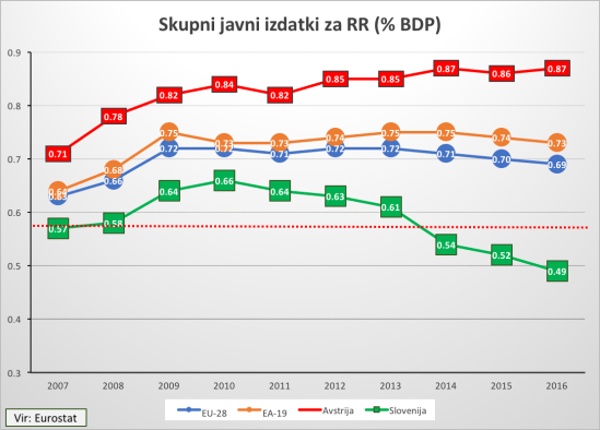 Pred nekaj tedni je kolega Jadran Lenarčič, direktor Inštituta Jožef Stefan, v Sobotni prilogi predstavil alarmantne podatke o padanju javnih izdatkov za raziskave in razvoj (RR) pod to vlado. In imel je zelo prav. Kot kaže spodnja slika, javni izdatki za RR, merjeni kot delež v BDP, strmo upadajo po letih 2009-2011. Od leta 2010 se je ta delež zmanjšal za 0.17% BDP (iz 0.66% na le še 0.49% v 2016). Za razliko od Slovenije, ostaja evropsko povprečje konstantno na ravni okrog 0.75% BDP, medtem ko Avstrija hitro drvi naprej in je povečala ta delež že na 0.87% BDP in se približuje staremu “lizbonskemu” cilju 1% BDP za javna vlaganja v RR.