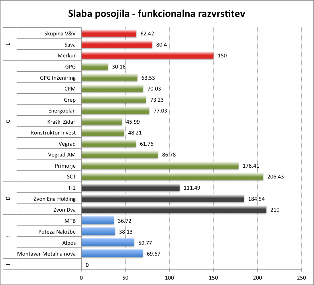 Kot kaže spodnja slika, po funkcionalni razdelitvi dejansko polovico na spisku vseh “slabih” dolžnikov tvorijo gradbeniki – skupaj za 942 mio evrov (48% celotnih slabih kreditov med Top-20 največjimi “slabimi” dolžniki). Večina izmed njih je že v stečaju. Na levi in desni strani bančne luknje pa najdemo le po tri zveneča imena. Na levi najdemo Merkur, Savo in Skupino Viator&Vektor, ki imajo skupaj za 293 mio evrov slabih kreditov (ali 15% vseh med Top-20). Na desni pa najdemo podjetja iz kroga mariborske škofije (Zvon Ena Holding in Zvon Dva ter T-2), ki imajo skupaj za 506 mio evrov slabih kreditov (ali 26% vseh med Top-20). V skladu s funkcionalno razdelitvijo torej hitro ugotovimo, da so glavnino slabih posojil pridelali gradbeniki, temu pa presenetljivo sledi desnica, medtem ko je levica tukaj relativno skromna. Desnih slabih kreditov med največjimi naj bi bi bilo celo za skoraj dvakrat več kot levih.