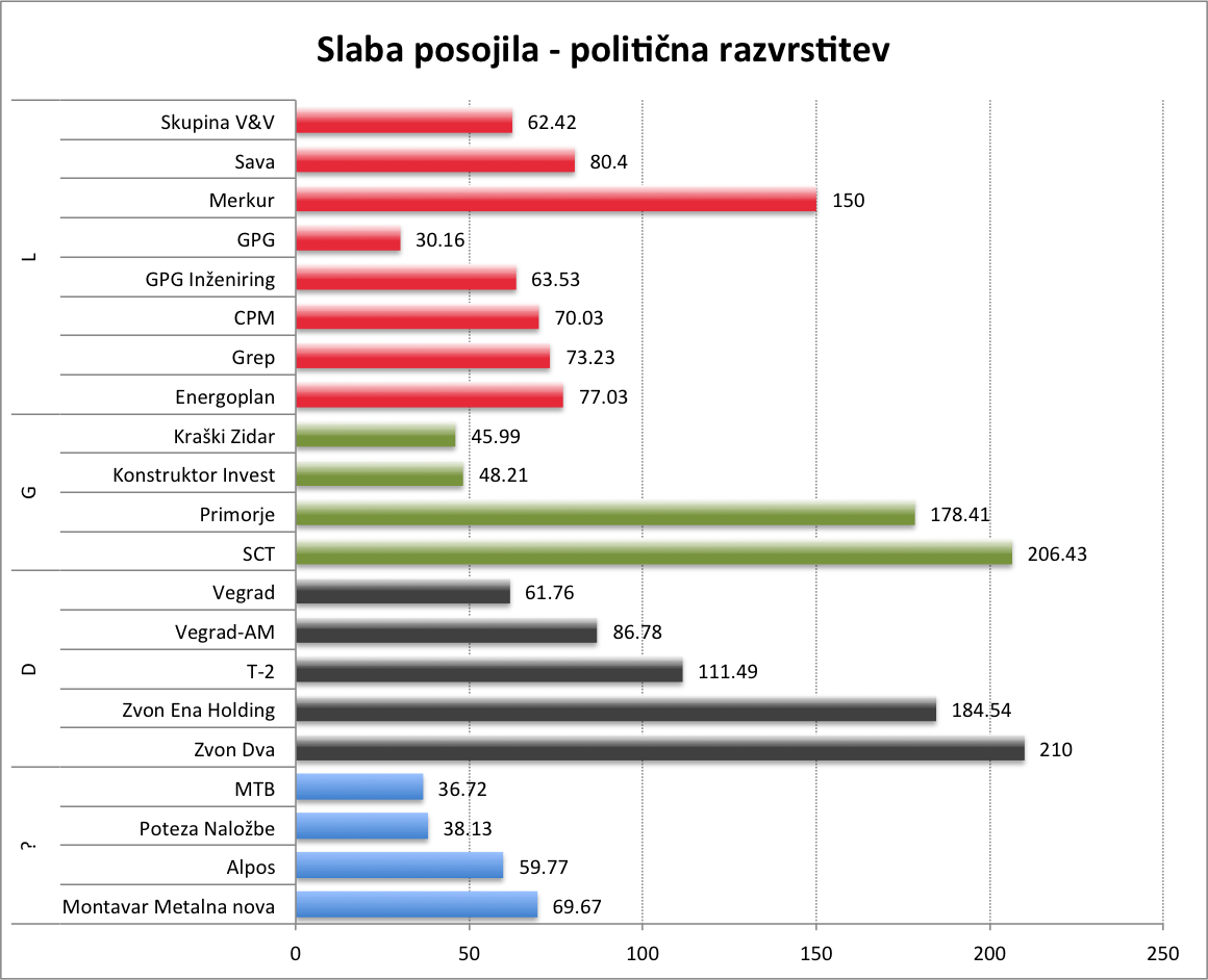Malce sem se poigral s tem spiskom ter imenom podjetij dodal oznake levi (L), desni (D), gradbeni (G) in neugotovljiv (?). Pri tem pa sem naredil dve različici označevanja. Prva je politična, in sicer sem pripisal oznako v skladu z zapisi v medijih, kateremu političnem polu naj bi pripadala uprava posameznega podjetja. Pri nekaterih gradbincih sem imel težave – denimo SCT je imel lovke razpredene na vseh straneh, od vrha slovenske Cerkve in Vatikana na eni do politične levice na drugi strani (en brat Jamnik je sedel v upravi SCT, drugi v upravi NLB, tretji pa je škof, sam Zidar pa je šel na avdienco k papežu). Takšnih gradbincev denimo nisem uvrstil nikamor, medtem ko sem Vegrad zaradi politične preteklosti Hilde Tovšak uvrstil na desno, Energoplan in GPG pa na levo. Za nekaj meni manj znanih podjetij pa sem pustil nevtralno oznako (?). Nato sem naredil še funkcionalno različico in vsem gradbincem dal enako oznako (G).
