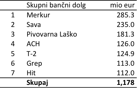 Ker strogo zaupnega poročila BS nimam, izhajam iz številk, objavljenih v Dnevniku o 20 največjih “slabih” dolžnikih, in sicer za njihove kredite, ki so bili klasificirani kot slabi. Če pogledamo spisek podjetij z največ slabimi posojili, ima prvih 20 največjih dolžnikov skupaj za 1,945 milijonov slabih obveznosti do bank. Pri tem ima največji “slabi” dolžnik za 210 mio evrov, dvajseti na spisku pa za 30 mio evrov slabih obveznosti. Še enkrat poudarjam, da imajo posamezna podjetja na spisku (razen tistih v stečaju, kot so gradbeniki) lahko tudi več skupnega dolga, vendar niso nujno vsi krediti že slabi. Na spisku so zajeti samo dolžniki z največ izkazanimi slabimi posojili. Manjkajo denimo Pivovarna Laško in ACH, ki (še) servisirata svoje obveznosti, Merkur pa je zabeležen samo z dvema tretjinama vseh dolgov. Hkrati pa na spisku manjkajo podjetja, ki so bila politično povezana in so dobivala ogromne kredite za slabe projekte (Hit, Luka Koper, Intereuropa itd.), vendar pa ta podjetja še “živijo” in uspevajo v celoti poplačevati kredite tudi za zgrešene projekte.