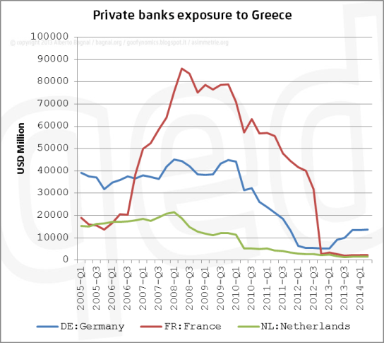 Nemčija in Francija kot arhitekta »reševanja« Grčije sta torej grški dolg do njunih privatnih bank, ki je bil tvegan zaradi možnega grškega bankrota, zgolj transformirali v dolg grške države do evrskih držav. Hkrati pa sta se rešili potrebe po sanaciji svojih bank, kar bi poslabšalo njune javnofinančne kazalce in stroške zadolževanja. Vso gnojnico pa zlile na Grčijo.