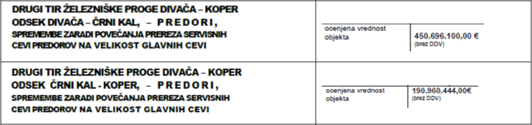 | Manjkajoči predori | (100-78)%*626 | 137 mio € brez DDV |