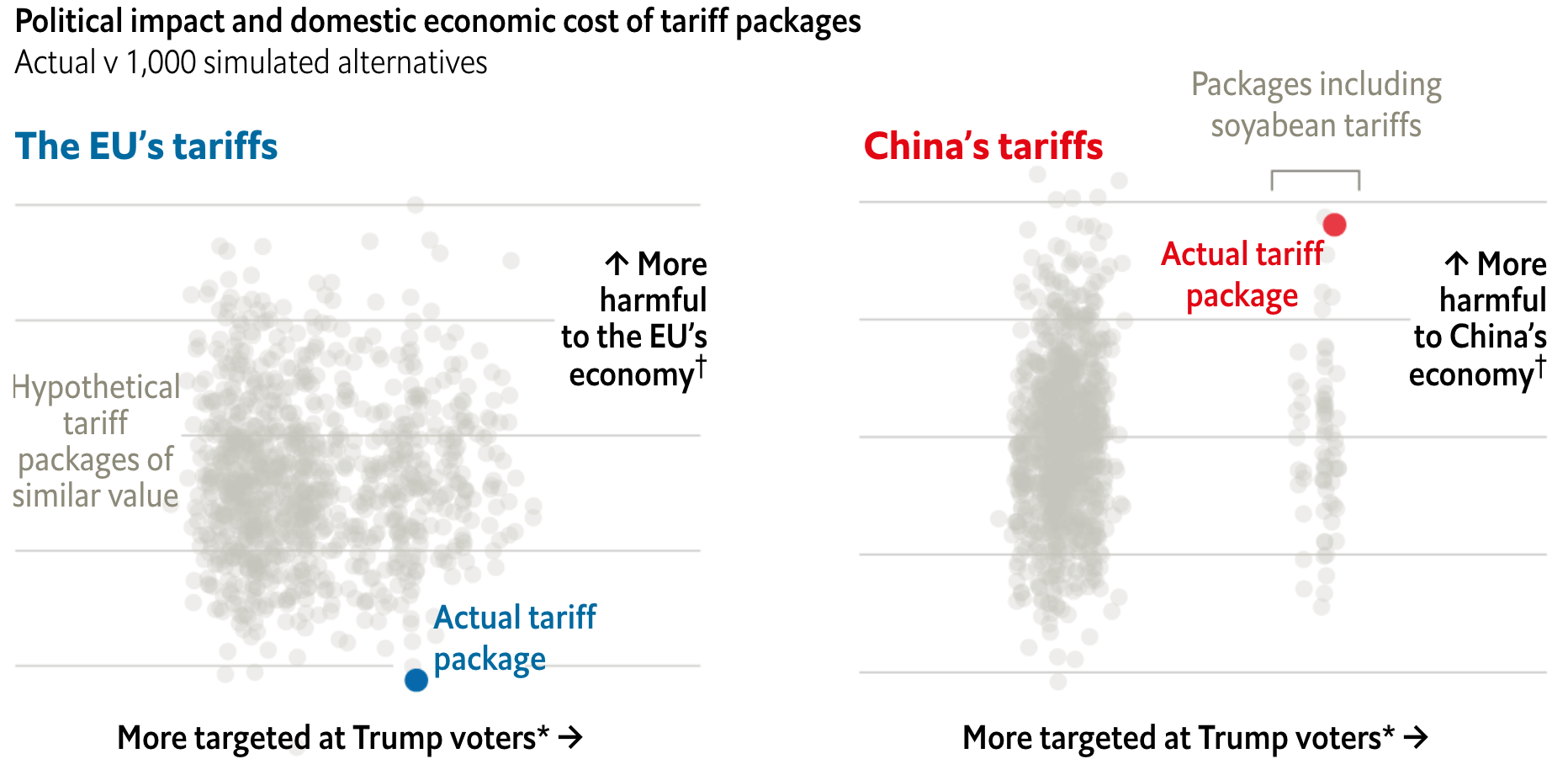Na drugi strani, je bila prioriteta kitajskih povračilnih ukrepov očitno, kako čim bolj prizadeti Trumpove volilce. Izbrani nabor proizvodov s strani Kitajske je bil iz vidika škode za Trumpove volilce boljši kot v 99% alternativnih vzorcev. Pri tem pa se kitajski voditelji niso ozirali na škodo za domače potrošnike, saj je bil izbran nabor izdelkov za kitajske potrošnike slabši kot v 99% alternativnih vzorcev. Tipičen primer je soja, ki jo pridelujejo predvsem v Trumpovoh volilnih okrajih, je pa hkrati največji uvozni proizvod Kitajske iz ZDA. Kitajska je pač želela kaznovati Trumpove volilce ne glede na domačo škodo.