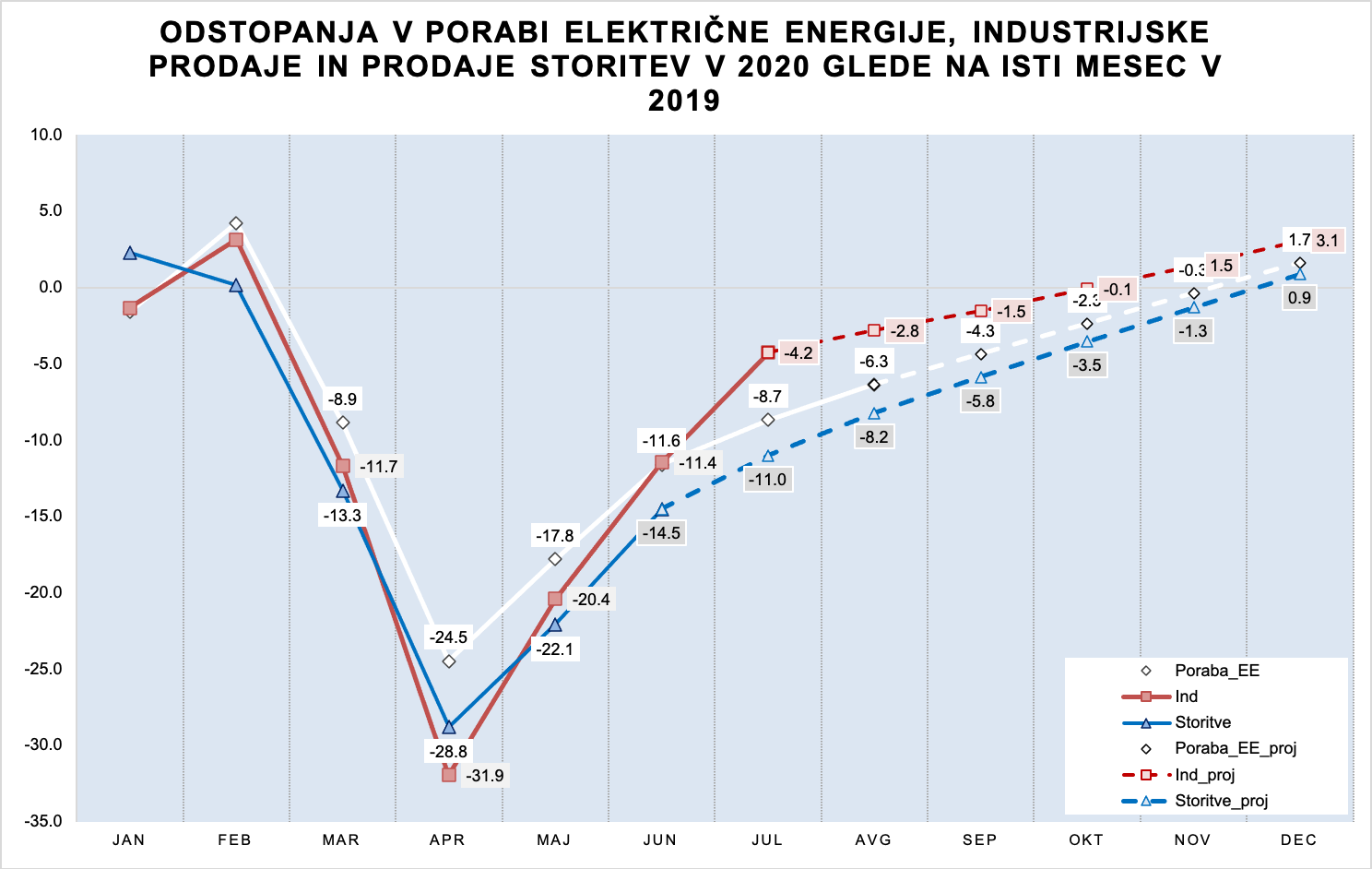 Zadnji podatki, ki so na voljo, kažejo na hitrejše okrevanje od pričakovanega pred meseci. Avgusta je poraba električne energije (EE) v gospodarskih subjektih za lansko porabo v istem mesecu zaostajala še za 6.3%. Julija pa je obseg industrijsske prodaje za lanskim v istem mesecu zaostajal le še za 4.2%. Počasnejše okrevanje se nadaljuje v storitvenih panogah, ki so junija (zadnji dosegljiv podatek) za lanskim obsegom prodaje zaostajale še za krepkih 14.5%. Če je zaupati indeksu porabe EE, naj bi se julija in avgusta tudi prodaja storitev močneje okrepila.