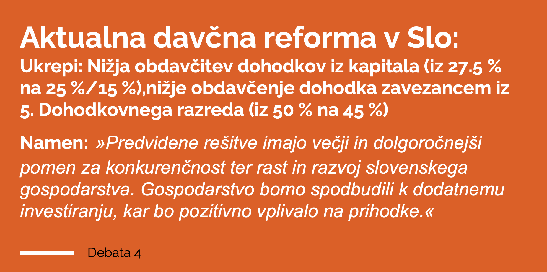 Tale razlaga je seveda privlečena za lase. Investicijsko okolje se s tem, ko nekaj tisoč ljudem z najvišjimi dohodki znižaš dajatve na njihove dohodke, seveda nič ne izboljša. Investicijsko okolje bi se denimo izboljšalo, če bi se zmanjšale administrativne ovire za investicije (zmanjšanje števila postopkov, skrajšanje časa za pridobitev dovoljenj, boljše sodelovanje med upravnimi organi, enotna točka za investicije), če bi vlada dala posebno administrativno podporo pomembnim investitorjem, če bi lokalne skupnosti dale na voljo komunalno opremljena zemljišča, če bi investitorjem dali “davčne počitnice” pri davku na dobiček (za denimo 3 leta), če bi povečali investicijske olajšave itd. Nič od tega vlada ne predlaga. Nižji davki za tiste z najvišjimi dohodki praktično tudi nimajo pomembnega vpliva na zmanjšanje stroškov za podjetja.