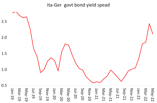 The ECB is now looking for ways to fund the weaker Eurozone governments by buying more of their debt and ‘printing’ money to do it. Ironically, having just announced that it had ended quantitative easing (QE) and looked to raise interest rates in July in order to control accelerating inflation, the ECB now had to revert back to QE for the likes of Italy.