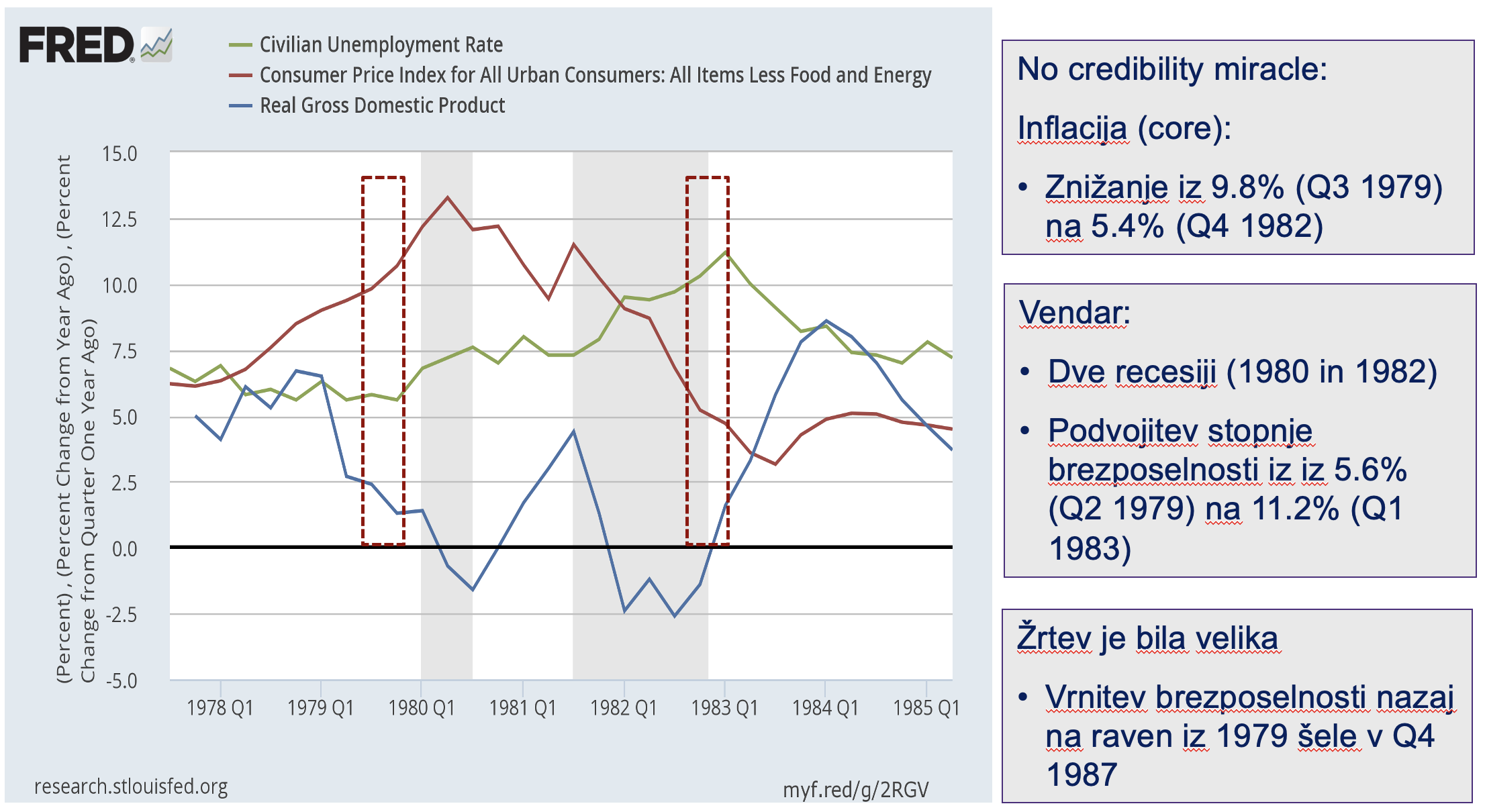 Torej tudi v mitski “Volckerjevi stagflaciji” krivec za povišano rast inflacije niso bile plače, pač pa – seveda – vzroki na strani ponudbe. Torej cene energentov, ki so se prvič povišale v prvem naftnem šoku leta 1973 in nato še enkrat v drugem naftnem šoku leta 1979. Volcker je kljub ponudbeni naravi povišane inflacije slednjo pobijal, kot da je povpraševalne narave (zaradi pregrevanja gospodarstva in povišane ravni cen), torej z drastičnim dvigovanjem obrestne mere. S to “napalm metodo” je pobil vso gospodarsko aktivnosti in ameriško gospodarstvo spravil v dvojno recesijo do leta 1982 ter podvojil stopnjo brezposelnosti na skoraj 11%. Inflacija je leta 1982 (tri leta po začetku dezinflacijske politike) sicer res upadla na 5%, toda na tej ravni je ostala še celo desetletje zatem, medtem ko se je stopnja brezposelnosti vrnila nazaj na raven izpred začetka “Volckerjevega junanškega boja proti inflaciji” (1979) šele 8 lete kasneje (1987). Spodnja slika kaže posledice tega mitskega Volckerjevega spopada z inflacijo.