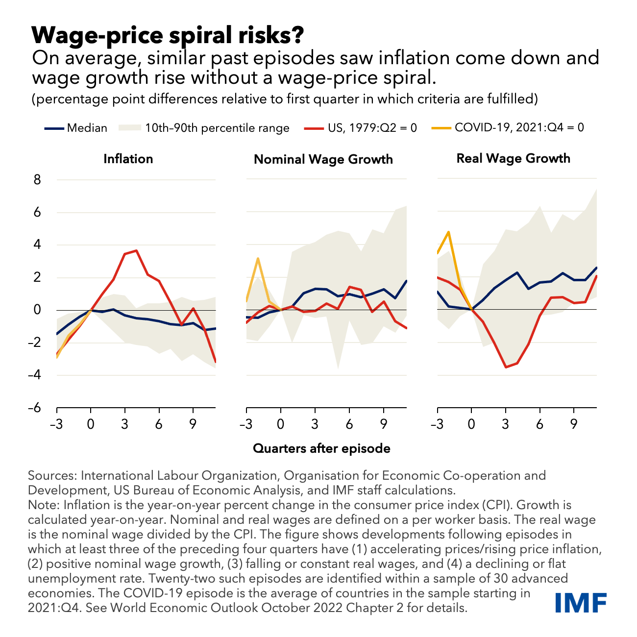 V zadnjem World Economic Outlooku (drugo poglavje) so raziskovalci IMF (s povzetkom na blogu IMF) iskali odgovor na to, ali se moramo v času sedanje povišane inflacije bati plačno-cenovne spirale. V ta namen so analizirali obdobje zadnjih 50 let in identificirali 22 situacij v razvitih državah s podobnimi razmerami kot leta 2021, ko je inflacija cen naraščala, rast plač je bila pozitivna, vendar so bile realne plače in stopnja brezposelnosti enake ali padajoče. Naleteli so na presenečenje: te epizode v povprečju niso povzročile spirale plač in cen. Namesto tega se je inflacija v naslednjih četrtletjih znižala, nominalne plače pa so postopoma rasle, kar je pomagalo k okrevanju realnih plač.