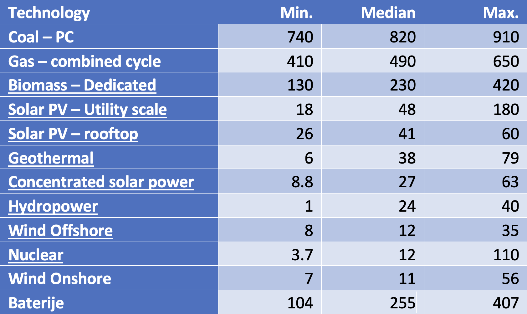 Tabela 1: Izpusti CO2 za posamezne tehnologije proizvodnje EE (v gCO2/kWh)