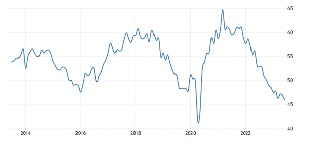 US ISM manufacturing index (score below 50 means contraction)