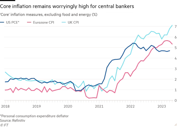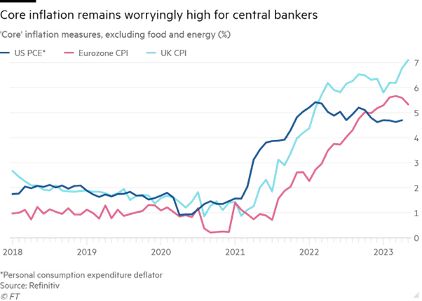But inflation of prices outside of food and energy, the so-called core inflation rate, is not falling in the major economies.