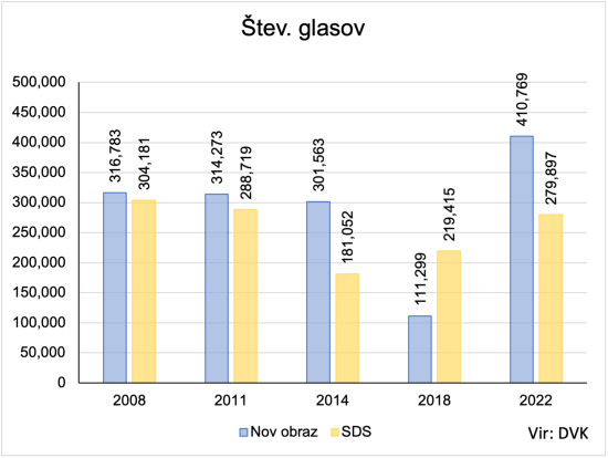 V to diskusijo se ne bom spuščal, sem pa pogledal, kaj kaže zgodovina glede alternativ. Eno je gotovo: po vseh treh vladah, ki jih je vodil Janez Janša, je na naslednjih volitvah zmagal ne-Janša. In to premočno (velja tudi za prehodno vlado Andreja Bajuka leta 2020). Vladanje Janše je najboljši recept, da na naslednjih volitvah zmaga levosredinska koalicija. Druga značilnost je, da je po političnih turbulencah v zadnjih dveh desetletjih levica bila (skoraj) vedno sposobna generirati “nov obraz”, ki je nato na volitvah zmagal. Kot kaže spodnja slika, je na zadnjih petih volitvah novim obrazom (skoraj) vedno uspelo na volitvah svoji stranki zagotoviti več kot 300,000 glasov (leta 2008 je kot nov obraz klasificiran Borut Pahor), kar je bilo dovolj za zmago pred SDS (katere zgornji domet je 304,000 glasov). Izjema je le leto 2018, ko na levi sredini ni uspelo zagotoviti dovolj kredibilnega novega obraza in so se glasovi razdelili med štiri stranke.