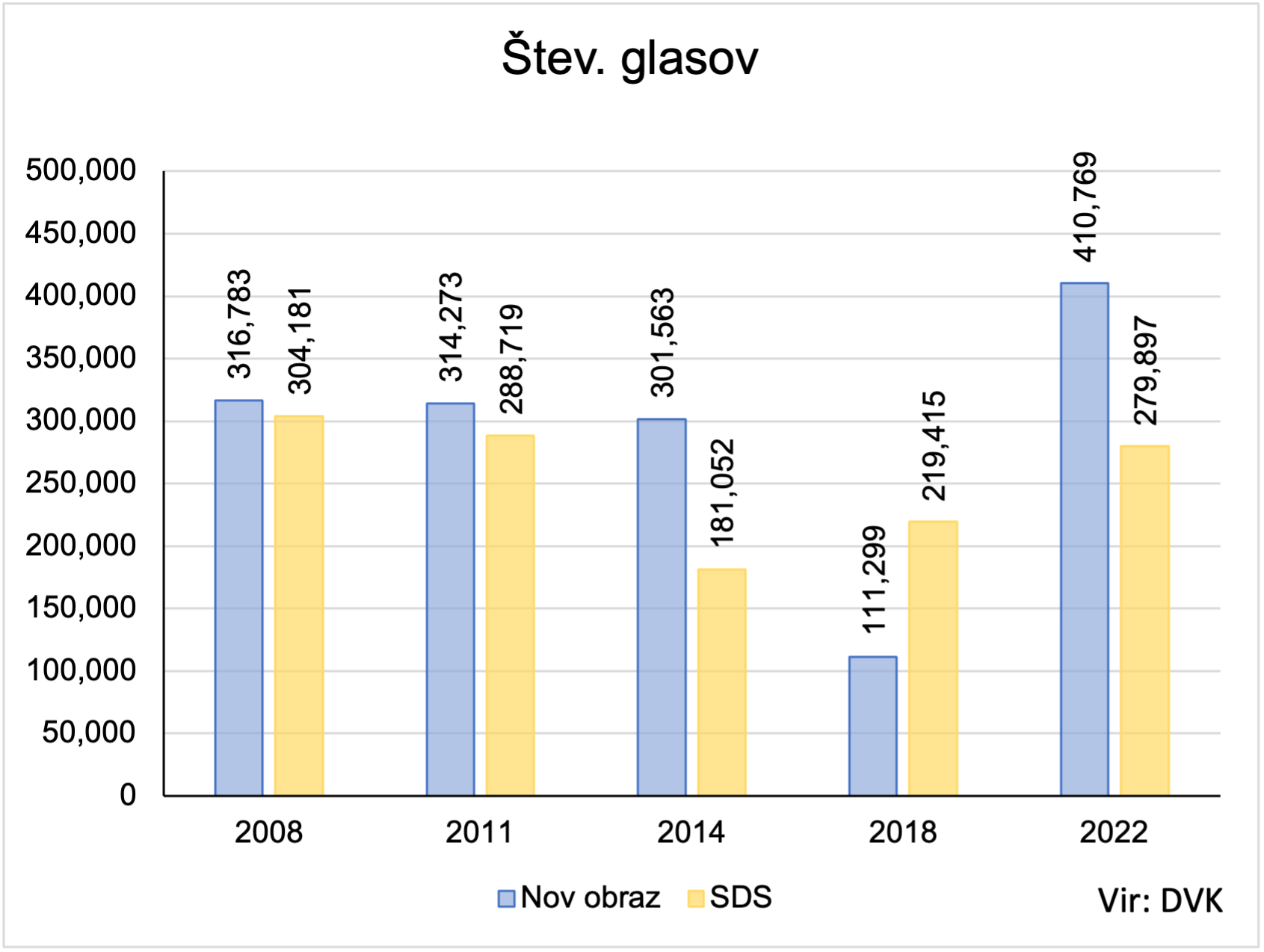 V to diskusijo se ne bom spuščal, sem pa pogledal, kaj kaže zgodovina glede alternativ. Eno je gotovo: po vseh treh vladah, ki jih je vodil Janez Janša, je na naslednjih volitvah zmagal ne-Janša. In to premočno (velja tudi za prehodno vlado Andreja Bajuka leta 2020). Vladanje Janše je najboljši recept, da na naslednjih volitvah zmaga levosredinska koalicija. Druga značilnost je, da je po političnih turbulencah v zadnjih dveh desetletjih levica bila (skoraj) vedno sposobna generirati “nov obraz”, ki je nato na volitvah zmagal. Kot kaže spodnja slika, je na zadnjih petih volitvah novim obrazom (skoraj) vedno uspelo na volitvah svoji stranki zagotoviti več kot 300,000 glasov (leta 2008 je kot nov obraz klasificiran Borut Pahor), kar je bilo dovolj za zmago pred SDS (katere zgornji domet je 304,000 glasov). Izjema je le leto 2018, ko na levi sredini ni uspelo zagotoviti dovolj kredibilnega novega obraza in so se glasovi razdelili med štiri stranke.
