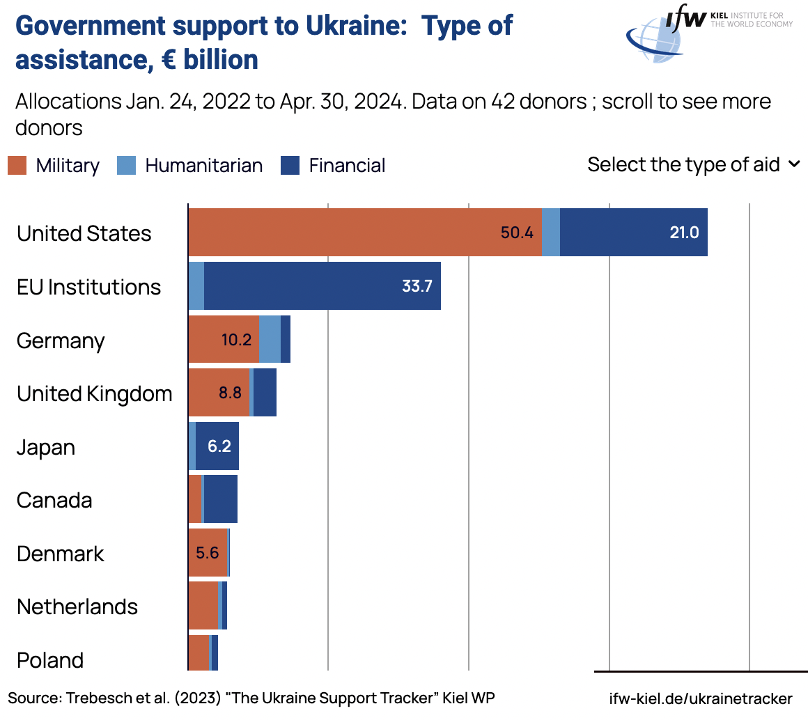 Kot kažejo podatki Inštituta za svetovno gospodarstvo v Kielu, so kumulativno evropske države Ukrajini sicer doslej “pomagale” celo bolj od ZDA. Absolutno so do sedaj za Ukrajino ZDA prispevale 74 milijard €, evropske države pa skupaj 102 milijardi €. Vendar so glavnino vojaške pomoči zagotovile ZDA (čez 50 milijard €), evropske države pa predvsem finančno in humanitarno pomoč.