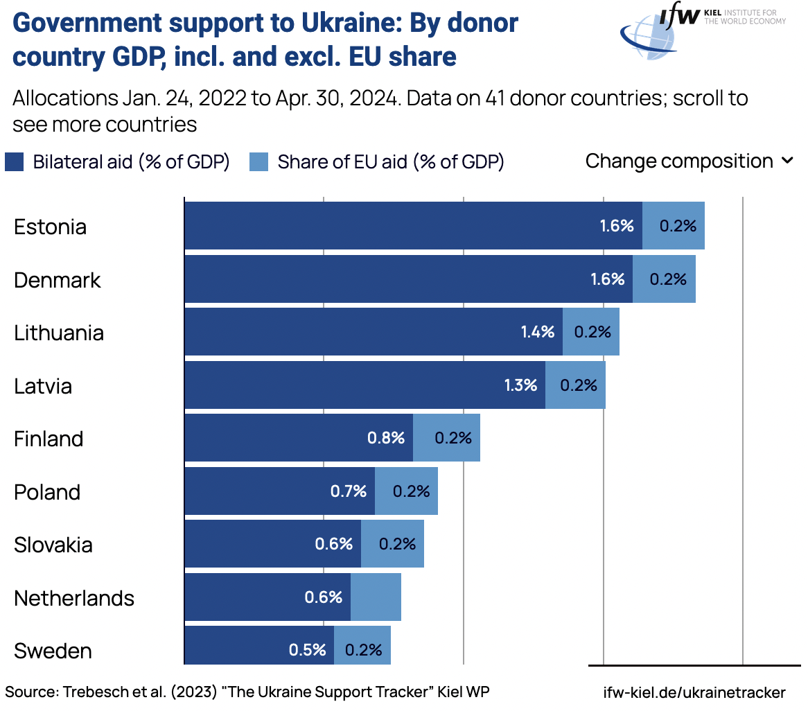 Relativno pa so Ukrajini največ pomagale majhne baltske in skandinavske države ter sosednje države (Poljska in Slovaška). Denimo Estonija je do sedaj Ukrajini namenila za 1.8 % BDP, Danska pa 1.6 % BDP, Litva in Latvija pa po 1.4 oziroma 1.3 % BDP.