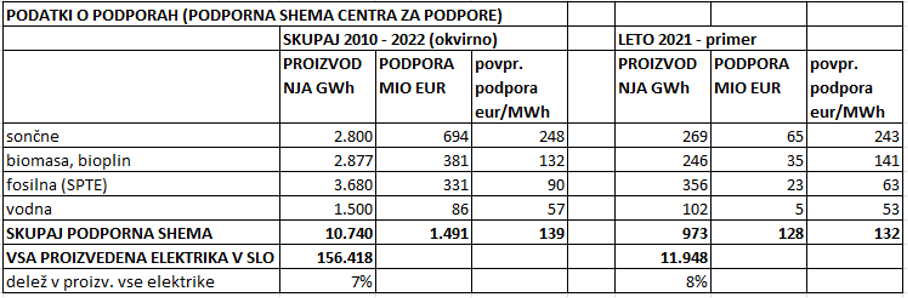 V spodnji tabeli so podatki o višini podpor ter proizvodnji električne energije v obratih, ki so koristili podpore pri postavitvi in/ali proizvodnji električne energije iz različnih virov. V obdobju 2010 do 2022 (za leto 2023 še ni dostopnih letnih poročil) je bilo tako za te namene izplačano skupaj okoli 1,5 milijarde eur, konec leta 2022 pa je imel Center za podpore 350 milijonov eur preostanka zbranih sredstev, ki še niso bila porabljena. Skupna proizvodnja električne energije v obratih, ki so koristili podpore je znašala 10,7 TWh ali okoli 7 % celotne proizvodnje elektrike v Sloveniji v omenjenih 13 letih. V povprečju smo za torej vsako proizvedeno megavatno uro električne energije v obratih, ki so vključeni v sistem podpor izplačali 139 eur subvencij, seveda iz žepov vseh odjemalcev električne energije.