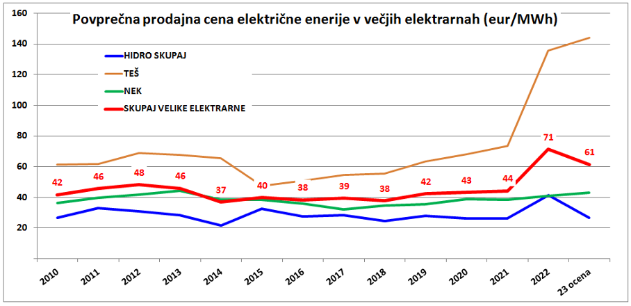 V spodnji sliki so podatki o povprečni prodajni ceni elektrike iz omenjenih elektrarn vse od leta 2010. Podatki so povzeti po javno dostopnih finančnih izkazih družb, ki imajo v lasti navedene elektrarne, sicer pa so te družbe povezane v dva energetska stebra Slovenije, v družbi HSE d.o.o. in GEN ENERGIJA d.o.o. Pri nuklearki smo po oceni dodali še 6 eur/MWh za stroške razgradnje jedrskih odpadkov. Trenutno se za te namene sicer odvaja 12 eur, ker se ta sredstva niso zbirala celotno obdobje delovanja NEK. Če torej pogledamo povprečno ceno prodane elektrike, ki so jo elektrarne prodale svojima lastnikoma (HSE, Gen energija), se je ta ves čas do leta 2021 gibala med 40 in 50 eur. Precej višja je bila zadnji dve leti, čeprav seveda daleč od cen po katerih se je z elektriko trgovalo na borzi ali jo prodajalo gospodarskim družbam v letu 2022 in 2023. Dvig povprečne cene je predvsem posledica povečanih stroškov delovanja TEŠ. Cena elektrike iz TEŠ je višja zaradi dražjih emisijskih kuponov, torej takse za onesnaževanje okolja, še bolj pa zaradi precej nižje proizvodnje ob celo nekaj višjih stroških obratovanja elektrarne. V letu 2022 je povprečna proizvodna cena v Sloveniji porasla tudi zaradi slabih hidroloških razmer (suša), a lani je bila proizvodnja v hidroelektrarnah zopet običajna, posledično tudi cena oziroma stroški proizvodnje.