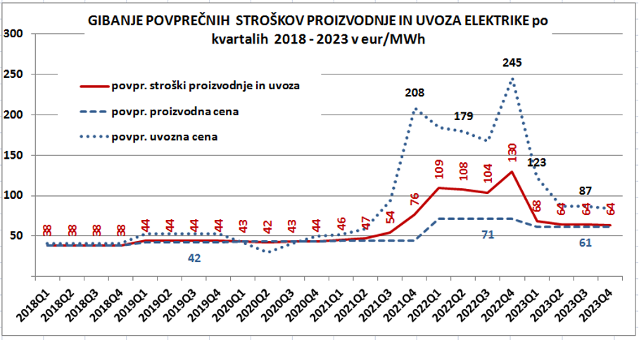 Na prvi sliki so podatki o povprečnih proizvodnih cenah elektrike v večjih državnih elektrarnah ter povprečnih uvoznih cenah elektrike po kvartalih (prekinjene črte). Proizvodnja cena v domačih elektrarnah se je do leta 2020 ves čas gibala okoli 40 eur/MWh. Do porasta je prišlo v letih 2022 in 2023 zaradi višjih cen elektrike iz TEŠ (dražji emisijski kuponi ter nižja proizvodnja ob celo še višjih stroških), v letu 2022 pa dodatno še zaradi manjše proizvodnje v hidroelektrarnah. Ker so bile hidrološke razmere lani ugodnejše, je bila cenejša tudi proizvodnja v hidroelektrarnah, kar je znižalo povprečno proizvodno ceno na okoli 60 eur/MWh.